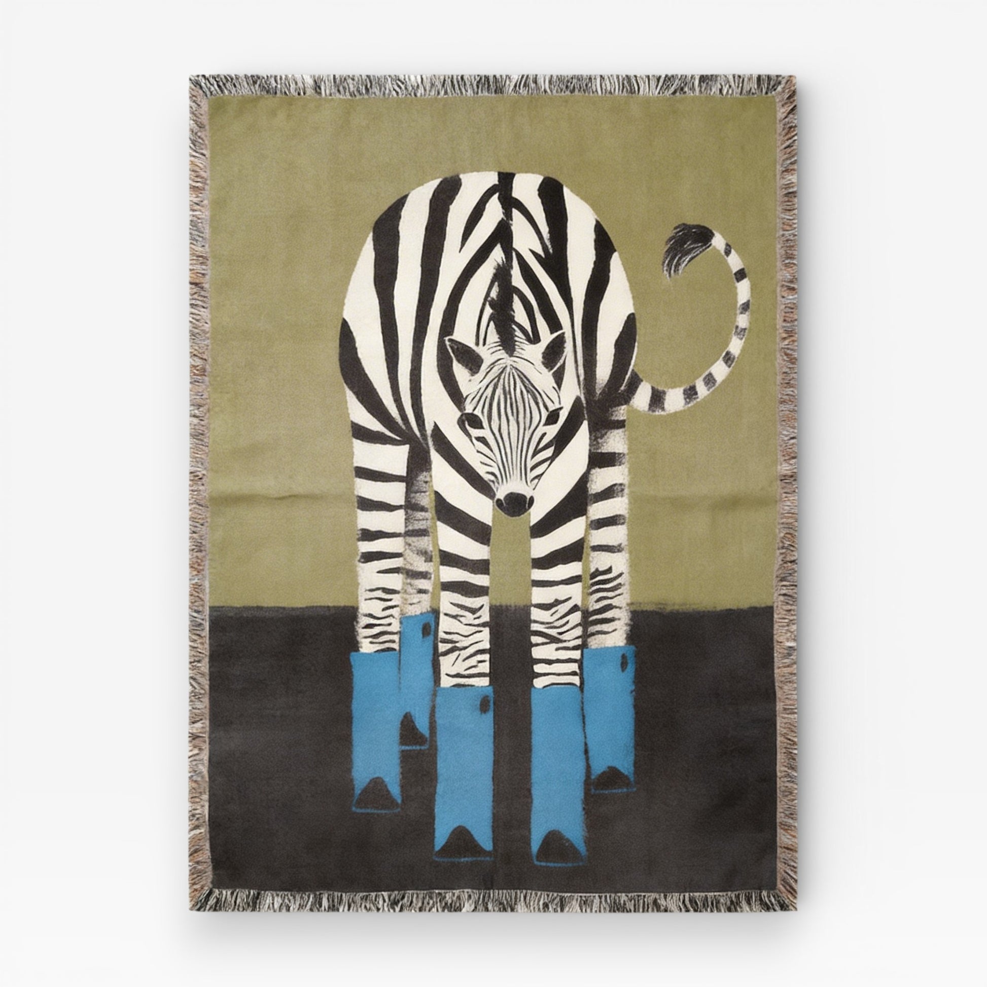 Blue Boots Zebra is a 100% cotton jacquard woven throw blanket featuring a bold zebra composition with unexpected blue accents and strong graphic contrast. The artwork is woven directly into the textile — not printed — creating dimensional depth and lasting texture.
