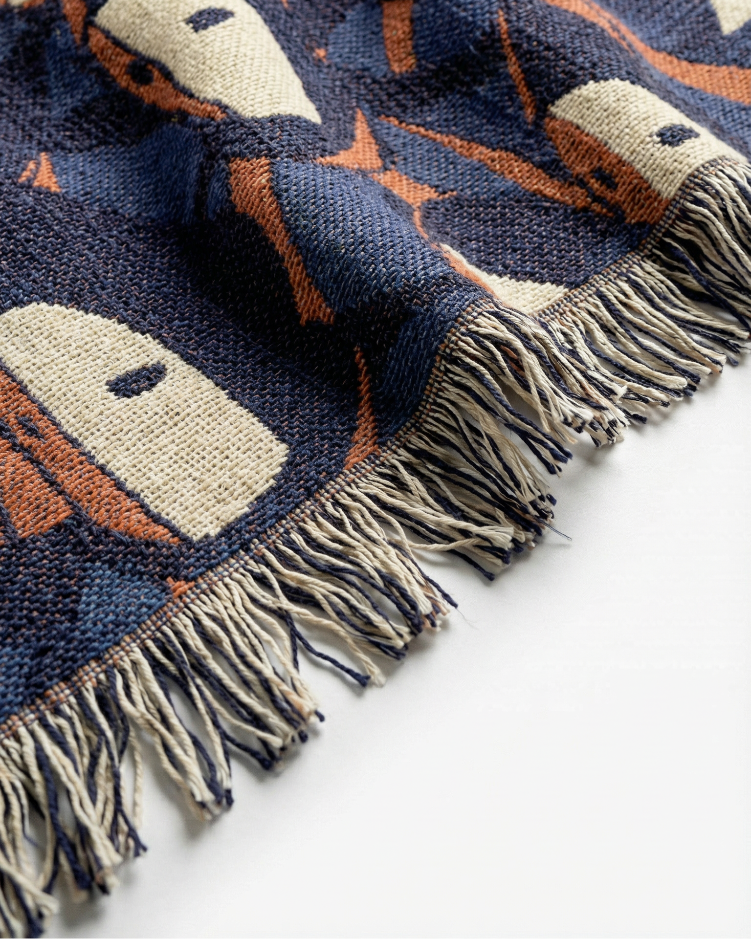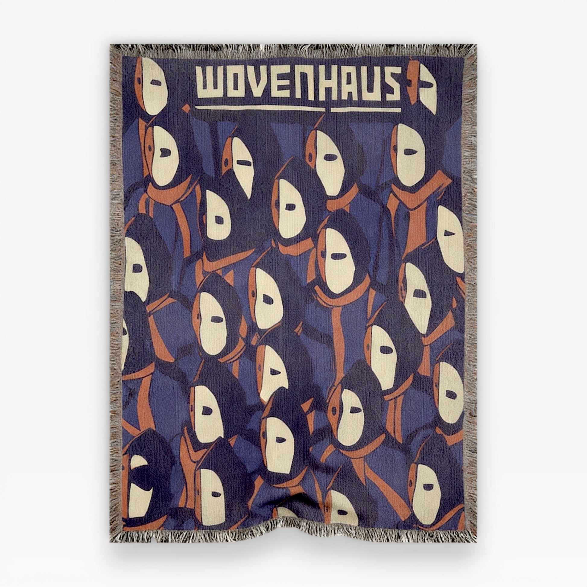 Silent Crowd is a 100% cotton jacquard woven throw blanket featuring a repeated masked figure composition with bold contrast and structured graphic rhythm. The artwork is woven directly into the textile — not printed — creating dimensional depth and lasting texture.
